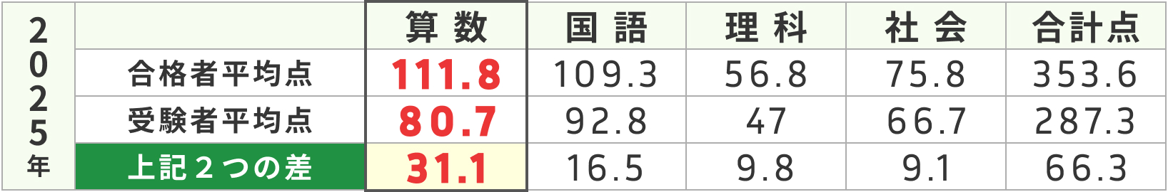 上記の入試データからも、算数が他科目に比べて、差のつく科目であることがわかると思います。