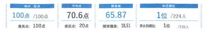 男女別偏差値70.1 最高点140点 平均点85.0点 1位/520名 ![]()