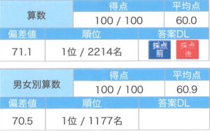 算数 100点/100点満点 偏差値71.1 1位/2,214人 平均点60.0点 男女別1位/1,037人