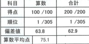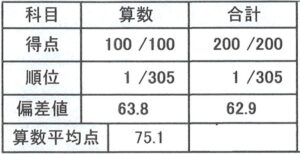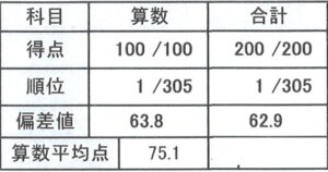 算数 100点/100点満点 1位/305人 偏差値63.8 平均点75.1点