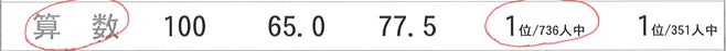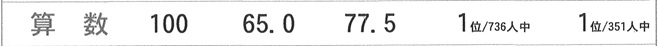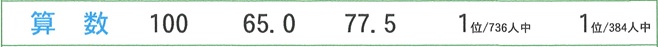 算数 100点/100点満点 偏差値65.0 平均点77.5点 1位/736人 男女別1位/351人![]()
