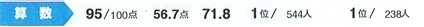 算数 95点/100点満点 平均点56.7点 偏差値71.8 1位/544人 男女別1位/238人
