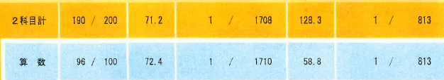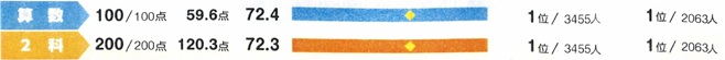 算数 100点/100点満点 平均点59.6点 偏差値72.4 1位/3,455人 男女別1位/2,063人 2科 200点/200点満点 平均点120.3点 偏差値72.3 1位/3,455人 男女別1位/2,063人