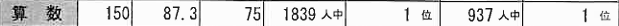 算数 150点/150点満点 平均点87.3点 偏差値75 1位/1,839人 男女別1位/973人