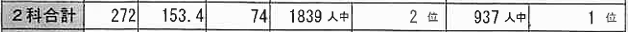2科合計 272点/300点満点 平均点153.4点 偏差値74 2位/1,839人 男女別1位/973人