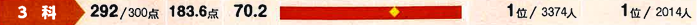 3科 292点/300点満点 平均点183.6点 偏差値70.2 1位/3,374人 男女別1位/2,014人