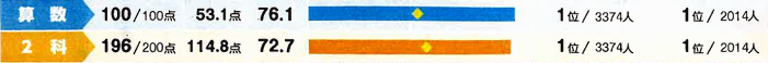 2科 196点/200点満点 平均点114.8点 偏差値72.7 1位/3,374人 男女別1位/2,014人