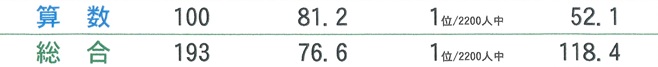 算数 100点/100点満点 偏差値81.2 1位/2,200人 平均点52.1点 総合 193点/200点満点 偏差値76.6 1位/2,200人 平均点118.4点