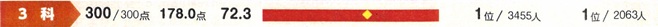 3科 300点/300点満点 平均点178.0点 偏差値72.3 1位/3,455人 男女別1位/2,063人