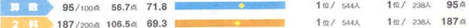 2科 187点/200点満点 平均点106.5点 偏差値69.3 1位/544人 男女別1位/238人![]()
