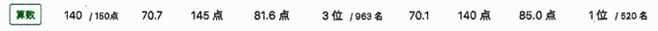 算数 140点/150点満点 偏差値70.7 最高点145点 平均点81.6点 3位/963人